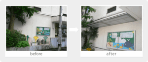 リフォーム詳細 リフォーム内容 日差し工事 費用 工期 1日間 商品仕様 概要 幼稚園のべピーカー置き場に雨避けのひさしを設置いたしました。